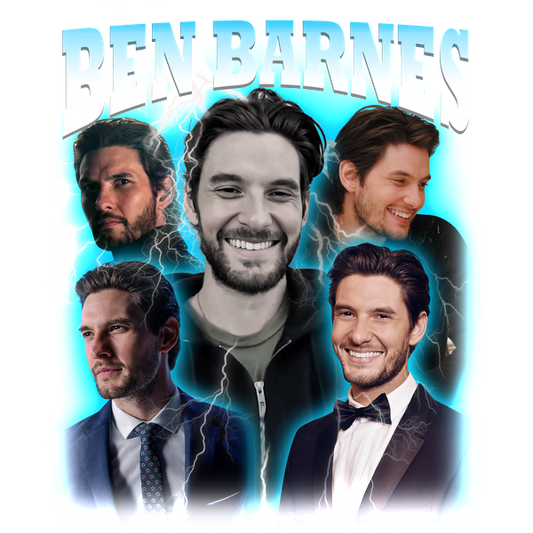 A vibrant collage featuring multiple images of Ben Barnes, showcasing his charming smiles and diverse looks against a striking background.DTF Transfers dtf transfers
