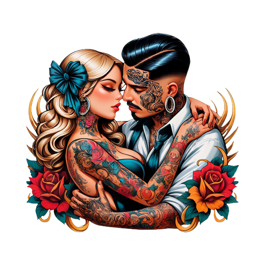A vibrant tattoo art piece featuring a couple in a passionate embrace, showcasing intricate floral tattoos and stylish hairstyles.DTF Transfersdtf regular iron