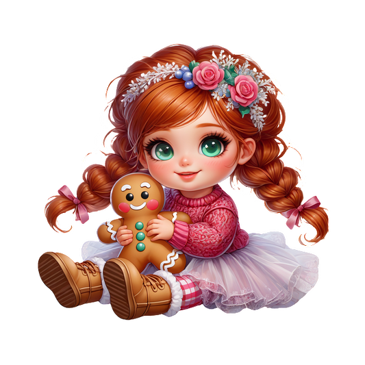 A cute animated girl with braided hair, wearing a sweater and skirt, joyfully hugs a gingerbread cookie.DTF Transfers dtf prints
