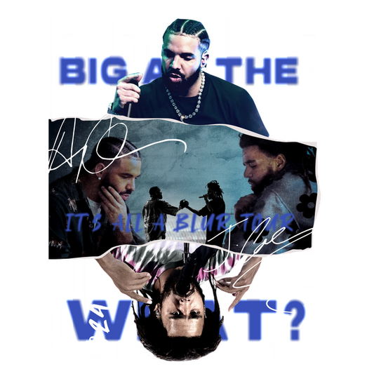 A vibrant graphic featuring Drake with dynamic text announcing his "It's All a Blur Tour," showcasing his energetic style and presence.DTF Transfers dtf prints
