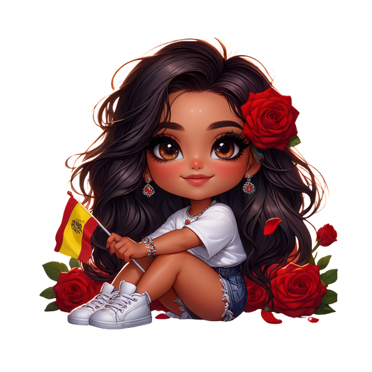 Prix habituel À partir de £0.74 GBPPrix habituelPrix unitaire / par£2.37 GBPPrix promotionnel À partir de £0.74 GBPA cute girl with long, wavy hair, dressed in a T-shirt and shorts, holding a Spanish flag amidst red roses.DTF Transfers heat press transfers