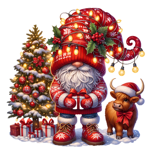 A festive gnome in a colorful hat stands next to a decorated Christmas tree and a cheerful calf, surrounded by gifts.DTF Transfers dtf prints