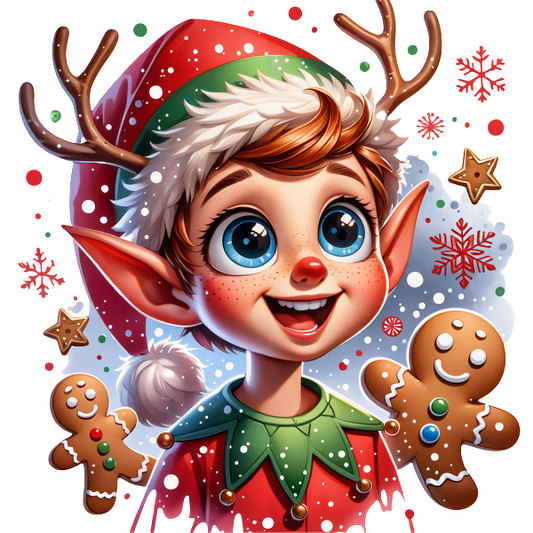 Cheerful elf wearing a festive hat and antlers, surrounded by gingerbread cookies and snowflakes, exuding holiday joy.DTF Transfers dtf transfers