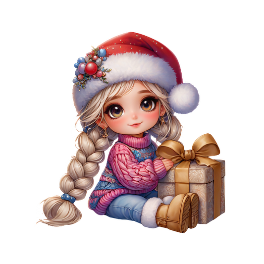 A cute girl in a festive Santa hat and cozy sweater happily holds a beautifully wrapped gift.DTF Transfers dtf transfers