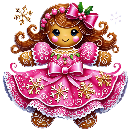 This charming gingerbread girl wears a festive pink dress adorned with snowflakes and a cute matching bow.DTF Transfers