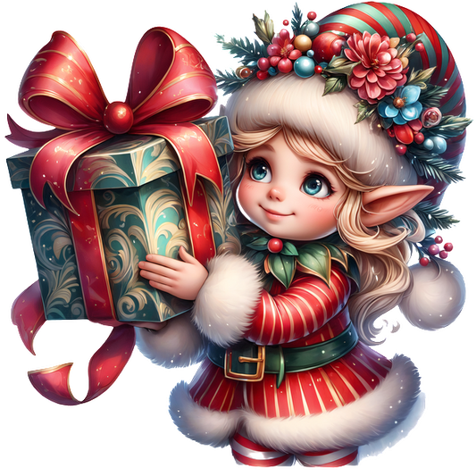 A cheerful elf in a festive red outfit holds a beautifully wrapped gift, adorned with colorful decorations and a big bow.DTF Transfers heat press transfers