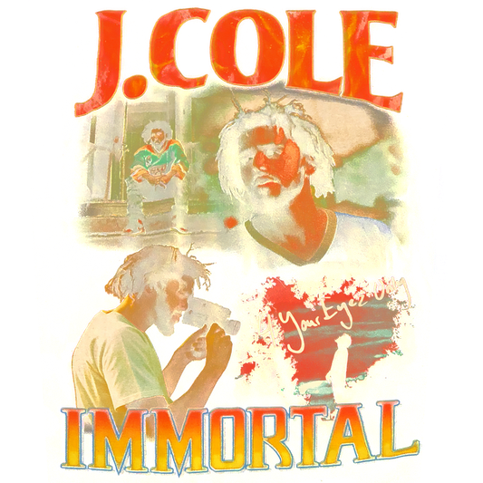 Vibrant artwork featuring J. Cole, titled "Immortal," showcasing his distinctive style and artistic expression.DTF Transfers