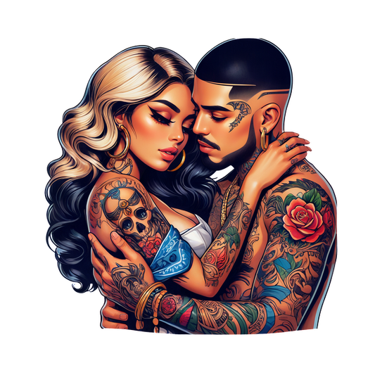 A passionate embrace between a tattooed couple, showcasing intricate body art and bold hairstyles, highlighting their strong connection.DTF Transfersdtf regular iron