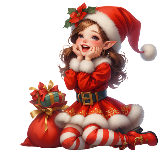 A cheerful elf girl in a festive red outfit with a Santa hat, surrounded by colorful gift bags, embodying holiday spirit.DTF Transfers heat press transfers