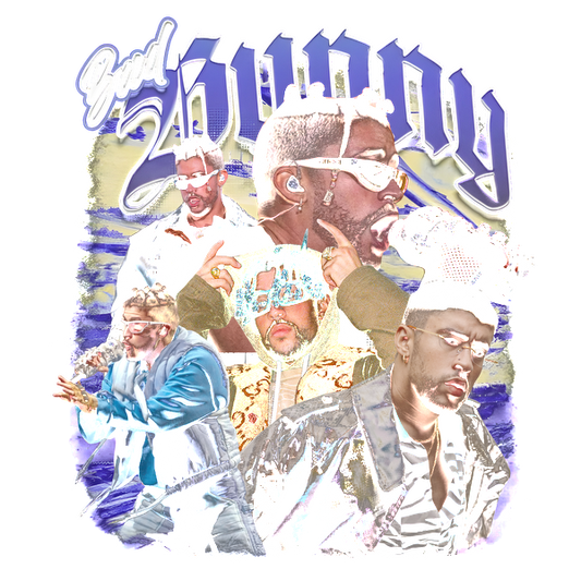 A vibrant collage featuring Bad Bunny in various outfits, showcasing his dynamic style and charisma in a colorful design.DTF Transfersdtf regular iron