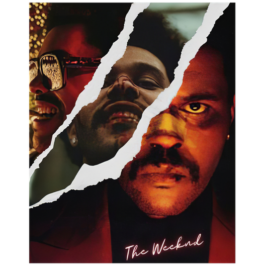 A striking album cover featuring The Weeknd with a creative torn design, showcasing his diverse expressions in vibrant colors.DTF Transfersdtf regular iron