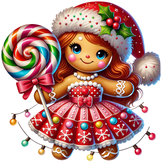 This festive gingerbread girl in a red dress holds a colorful lollipop, adorned with candy details and a holiday hat.DTF Transfers