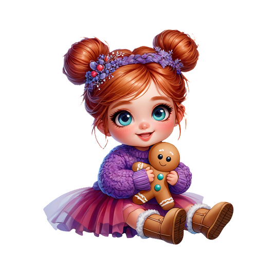 A cheerful little girl in a cozy purple sweater and pink skirt, cuddling a gingerbread cookie toy.DTF Transfers heat press transfers