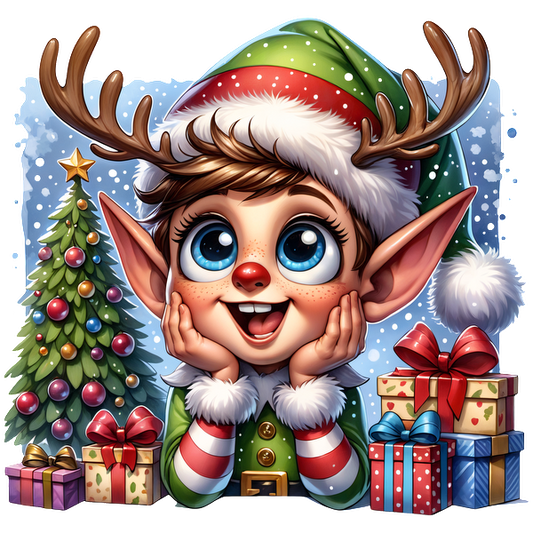 A cheerful elf with antlers, wearing a festive green and red outfit, surrounded by Christmas gifts and a decorated tree.DTF Transfers dtf prints