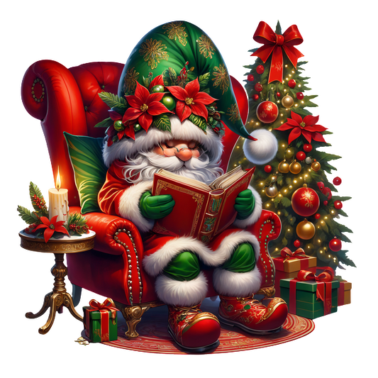 A whimsical Santa Claus sits reading a book in a plush red chair, surrounded by festive decorations and a Christmas tree.DTF Transfers heat press transfers