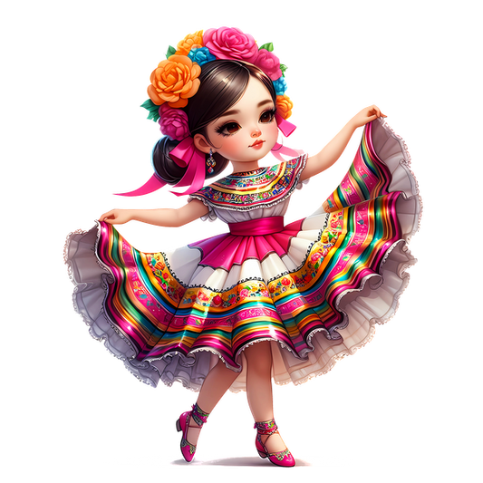 A charming girl in a colorful traditional Mexican dress, complete with a decorative sombrero and bright floral patterns, dances joyfully. heat press transfers