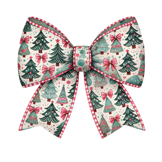 A festive Christmas bow adorned with a playful pattern of trees, ornaments, and ribbons, perfect for holiday decorations. heat press transfers