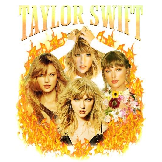 A vibrant collage of Taylor Swift featuring four different looks surrounded by a fiery backdrop, showcasing her captivating style.DTF Transfersdtf regular iron