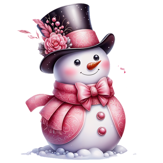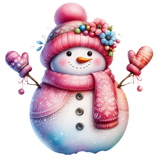 A charming snowman adorned with a pink hat, matching scarf, and colorful flowers, holding mittens and exuding festive cheer. heat press transfers dtf prints