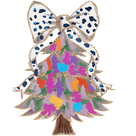 A vibrant, colorful Christmas tree adorned with a bold polka dot bow, featuring playful splashes of various hues.DTF Transfersdtf regular iron