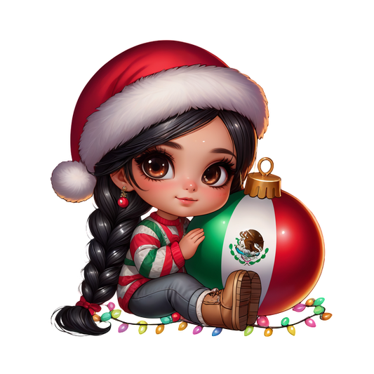 A cute girl in a Santa hat and festive outfit cuddles a large ornament featuring the Mexican flag, surrounded by Christmas lights.DTF Transfers dtf prints