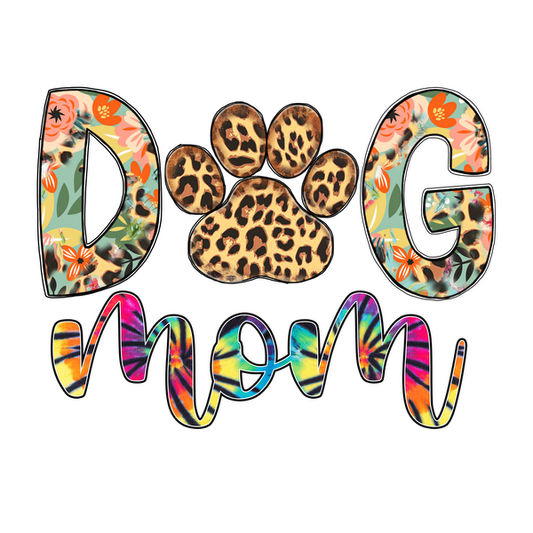 A vibrant and playful "Dog Mom" design featuring floral and leopard print letters, perfect for proud dog owners!DTF Transfersdtf regular iron