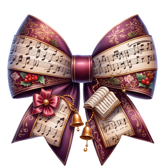 A festive, decorative bow featuring music sheets, vibrant colors, and charming accents like bells and holly for a joyful touch. heat press transfers