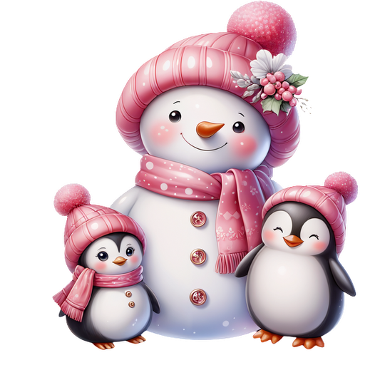 A cheerful snowman and two adorable penguins, all wearing pink hats and scarves, spread festive winter joy. heat press transfers