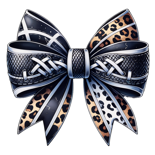 Stylish ribbon bow featuring a mix of black and leopard print patterns, complete with intricate lace-up detailing for a fashionable touch.