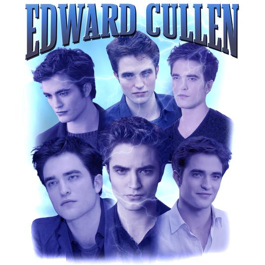 A striking collage of Edward Cullen showcasing multiple expressions against a blue, lightning-themed background.DTF Transfers dtf prints