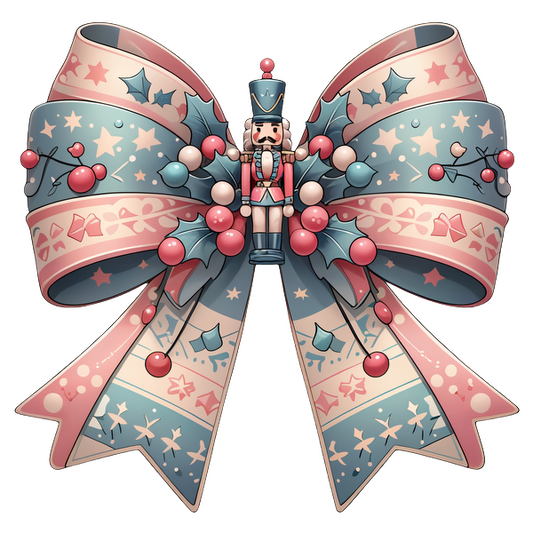 This festive bow features a charming nutcracker centerpiece, adorned with pastel colors, holly, and playful ornaments, perfect for holiday decoration.