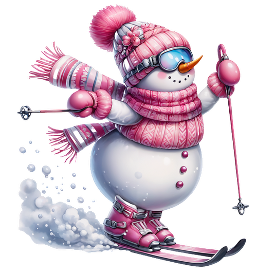 A cheerful snowman dressed in pink skiing attire, complete with a cozy scarf, hat, and goggles, gracefully glides through the snow. heat press transfers