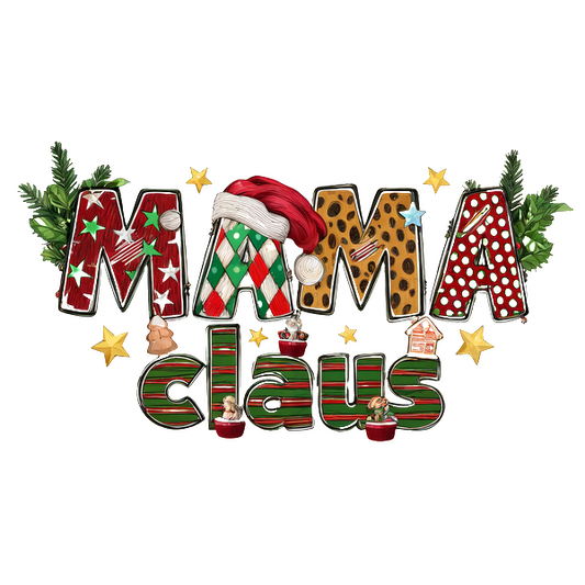 Festive "Mama Claus" design featuring colorful, decorative letters, a Santa hat, and charming holiday motifs for a cheerful holiday vibe.dtf regular iron