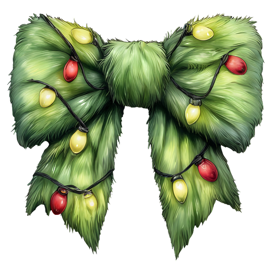 A festive, green bow adorned with colorful lights, perfect for adding holiday cheer to decorations. heat press transfers