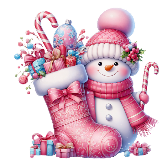 A cheerful snowman in a pink knitted hat stands beside a festive pink stocking filled with gifts and candy canes. heat press transfers