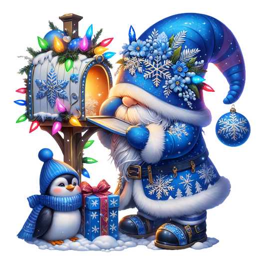 A whimsical winter scene featuring a gnome in a blue, snowy outfit, checking a festive mailbox with a cheerful penguin nearby.DTF Transfers dtf prints