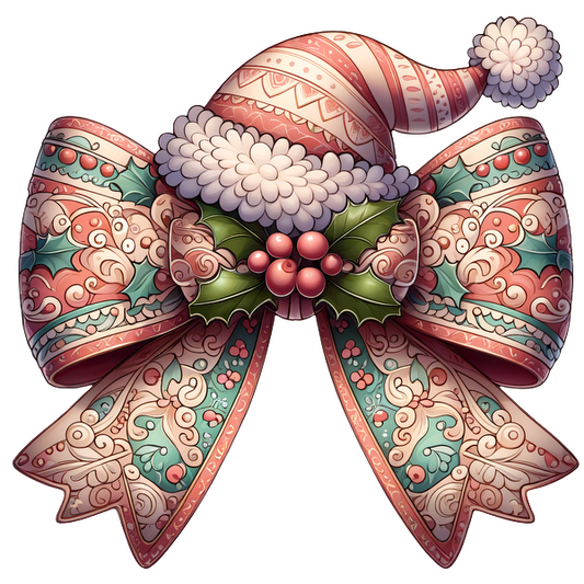 A whimsical, intricately designed Christmas bow featuring festive patterns, holly leaves, and a playful Santa hat on top. dtf transfers