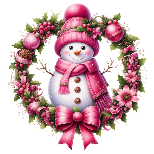A cheerful snowman dressed in pink attire, surrounded by a festive wreath of holly, flowers, and ornaments. dtf transfers