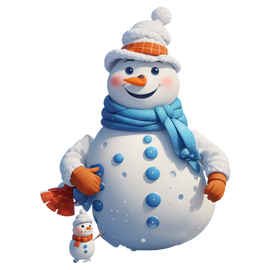 A cheerful, cartoonish snowman with a blue scarf and orange hat, holding a small snowman, radiates winter joy.DTF Transfers dtf transfers