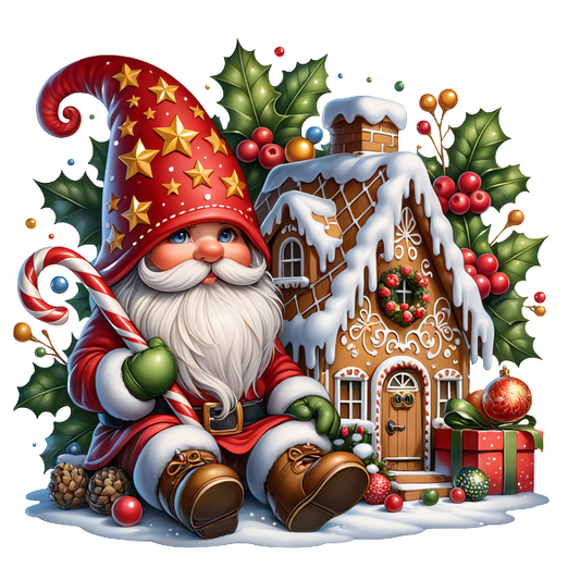 A cheerful Christmas gnome with a red starry hat holds a candy cane beside a snowy gingerbread house and festive gifts.DTF Transfers dtf prints
