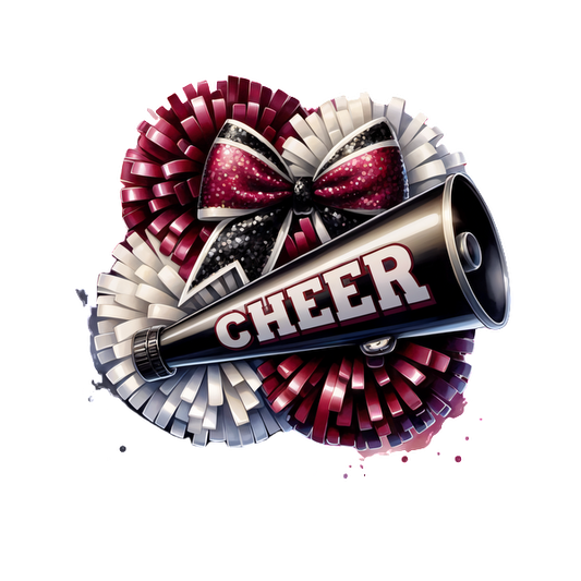A colorful cheerleading design featuring a megaphone with "CHEER" and vibrant pom-poms adorned with a sparkly bow.DTF Transfers dtf transfers