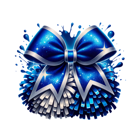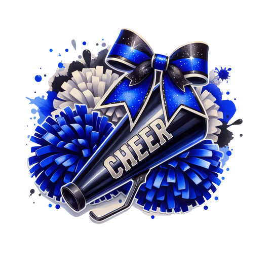 A vibrant cheerleading megaphone adorned with a blue bow and surrounded by colorful pom-poms, celebrating team spirit.DTF Transfersdtf regular iron