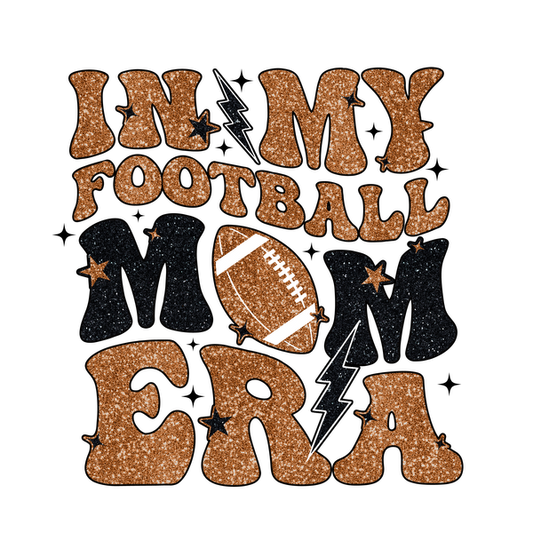 A fun and sparkly graphic featuring the phrase "In My Football Mom Era" alongside a football and lightning bolts. heat press transfers
