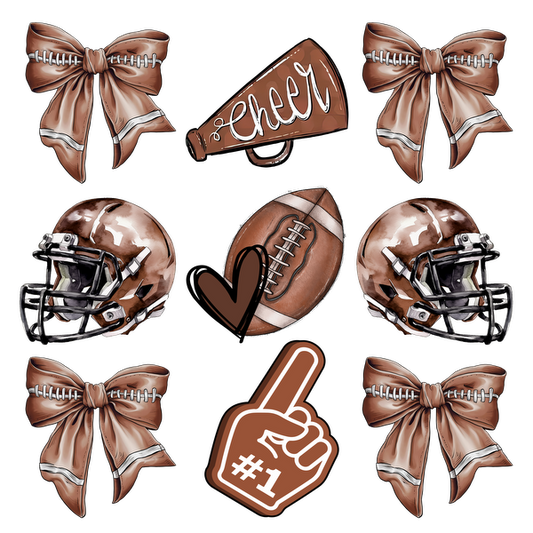 A collection of football-themed graphics, including helmets, a football, a cheerleading megaphone, and decorative bows. dtf transfers