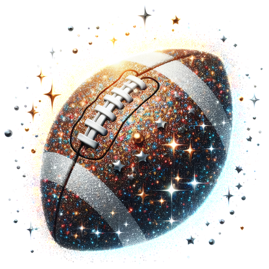 A sparkling, glittery football adorned with stars and colorful swirls, perfect for adding a touch of fun to your game!dtf regular iron