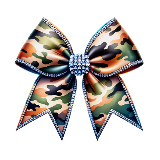 A stylish camouflage bow adorned with sparkling gemstones, perfect for adding a unique flair to any outfit.DTF Transfers heat press transfers
