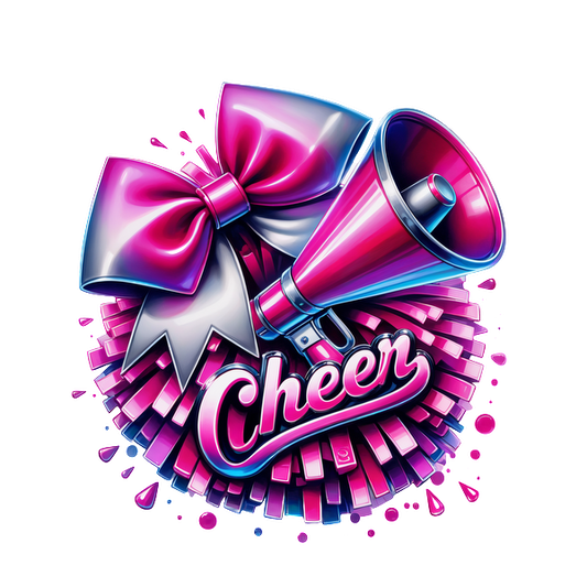 A vibrant graphic featuring a cheerleading megaphone, pink bows, and a cheerful "Cheer" design, perfect for spirited events.DTF Transfers heat press transfers