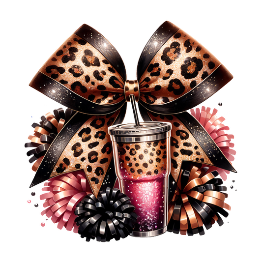 A trendy leopard print cup with a straw is surrounded by a large, elegant bow and colorful pom-poms.DTF Transfersdtf regular iron