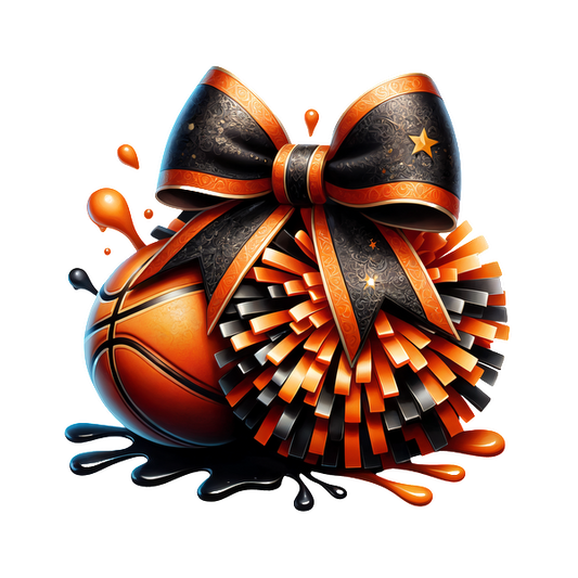 A vibrant illustration featuring a basketball adorned with a stylish black and orange bow, alongside a matching pom-pom.DTF Transfers dtf transfers