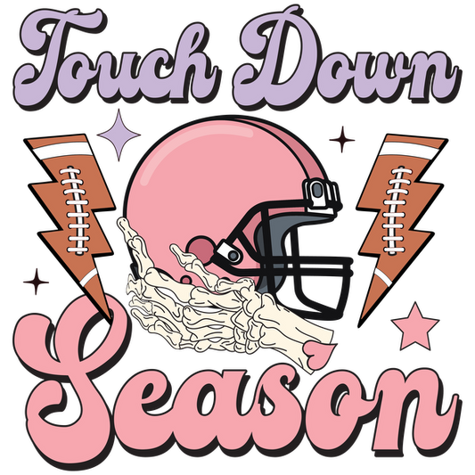 A fun and vibrant graphic featuring a pink football helmet, text that reads "Touch Down Season," and whimsical lightning bolts and hands. dtf prints